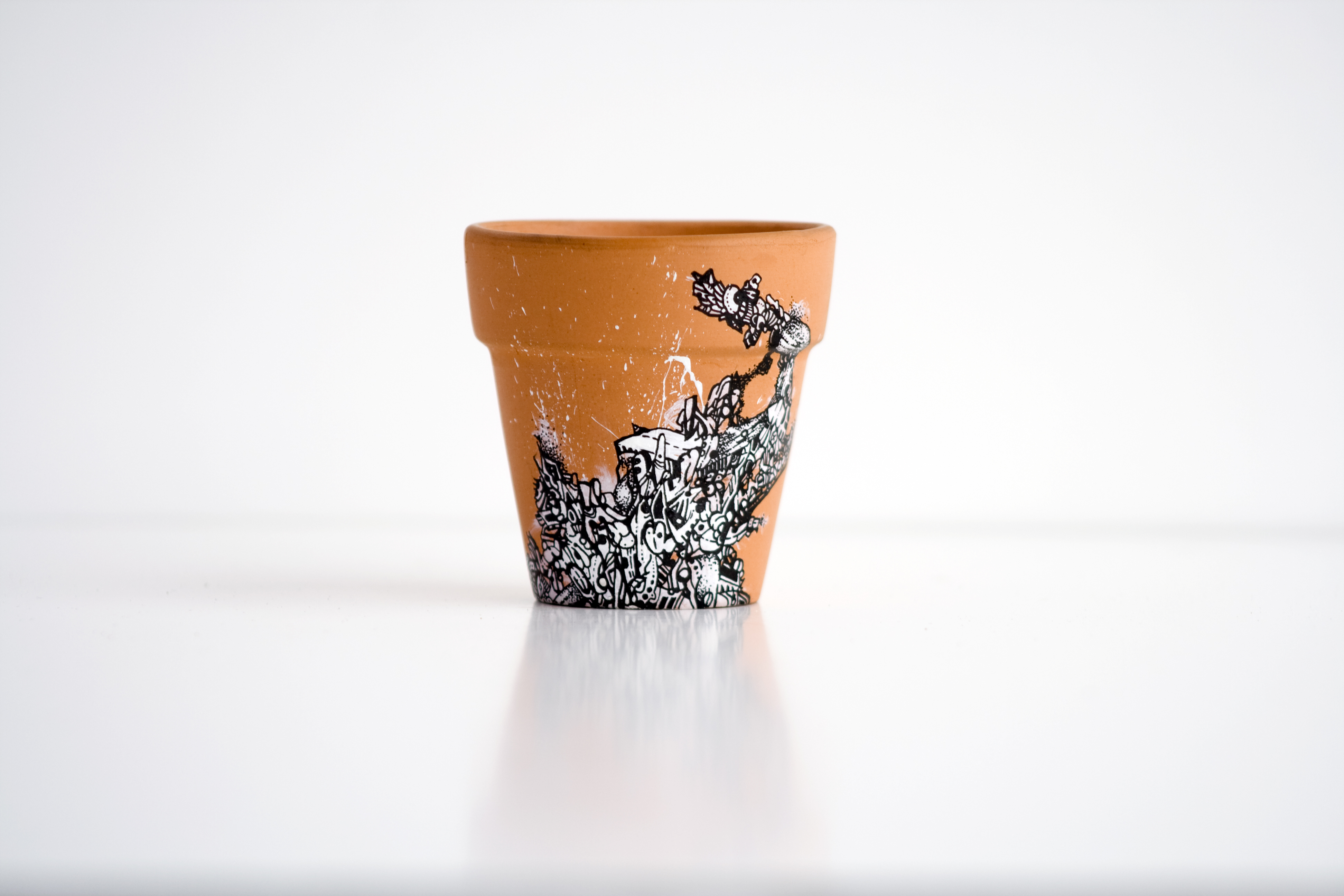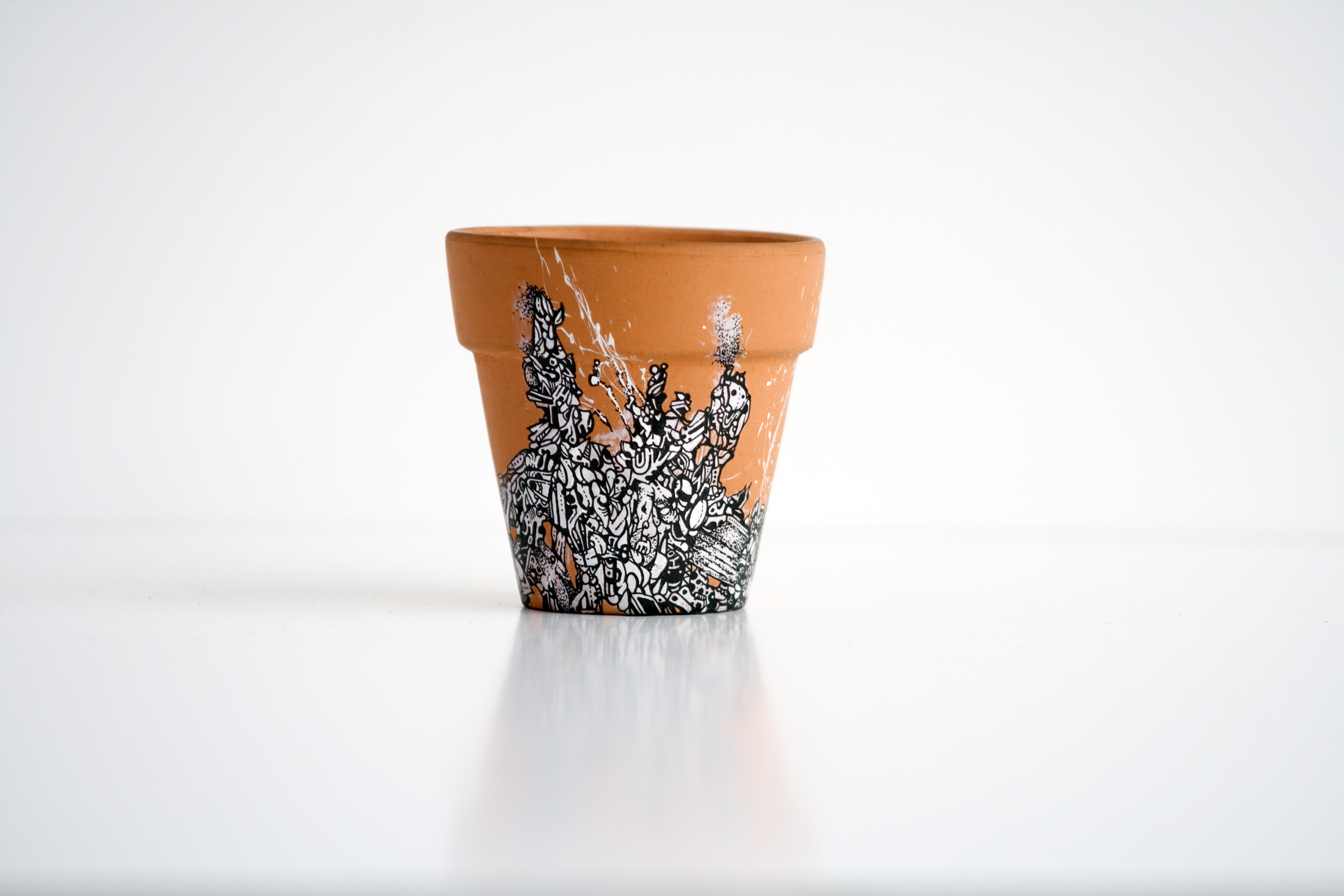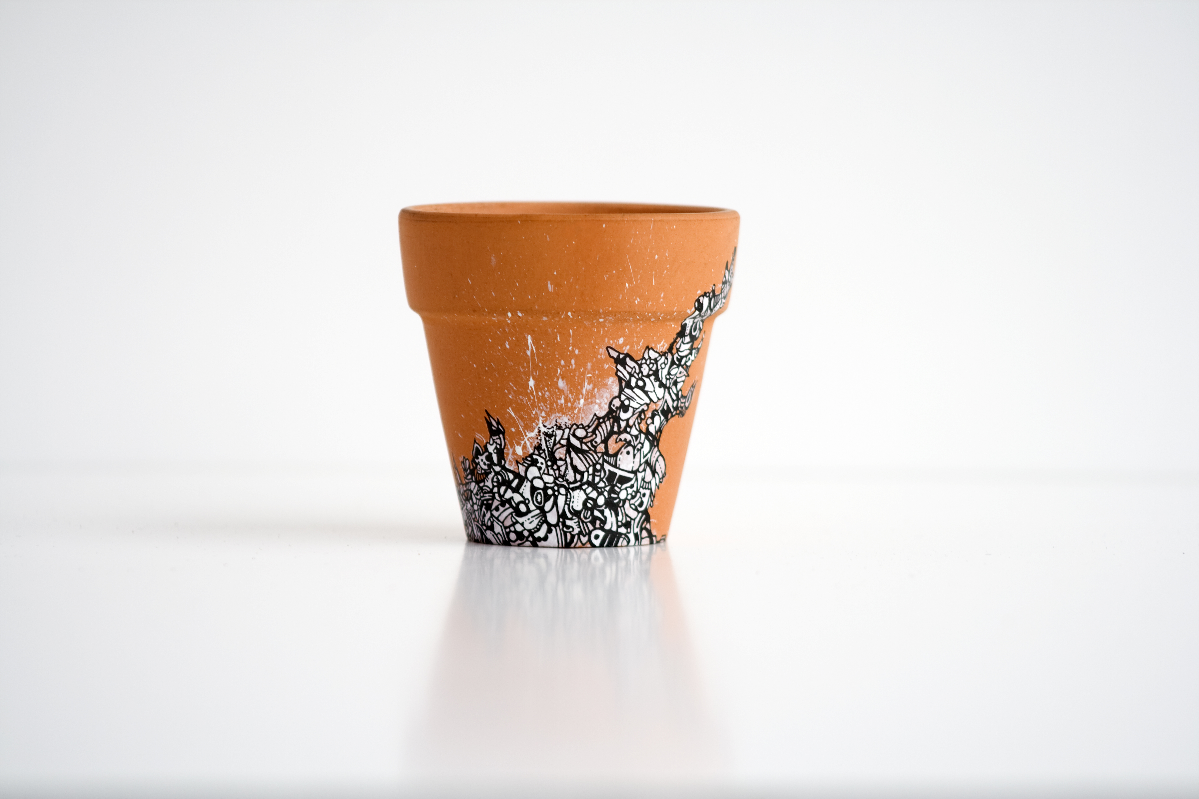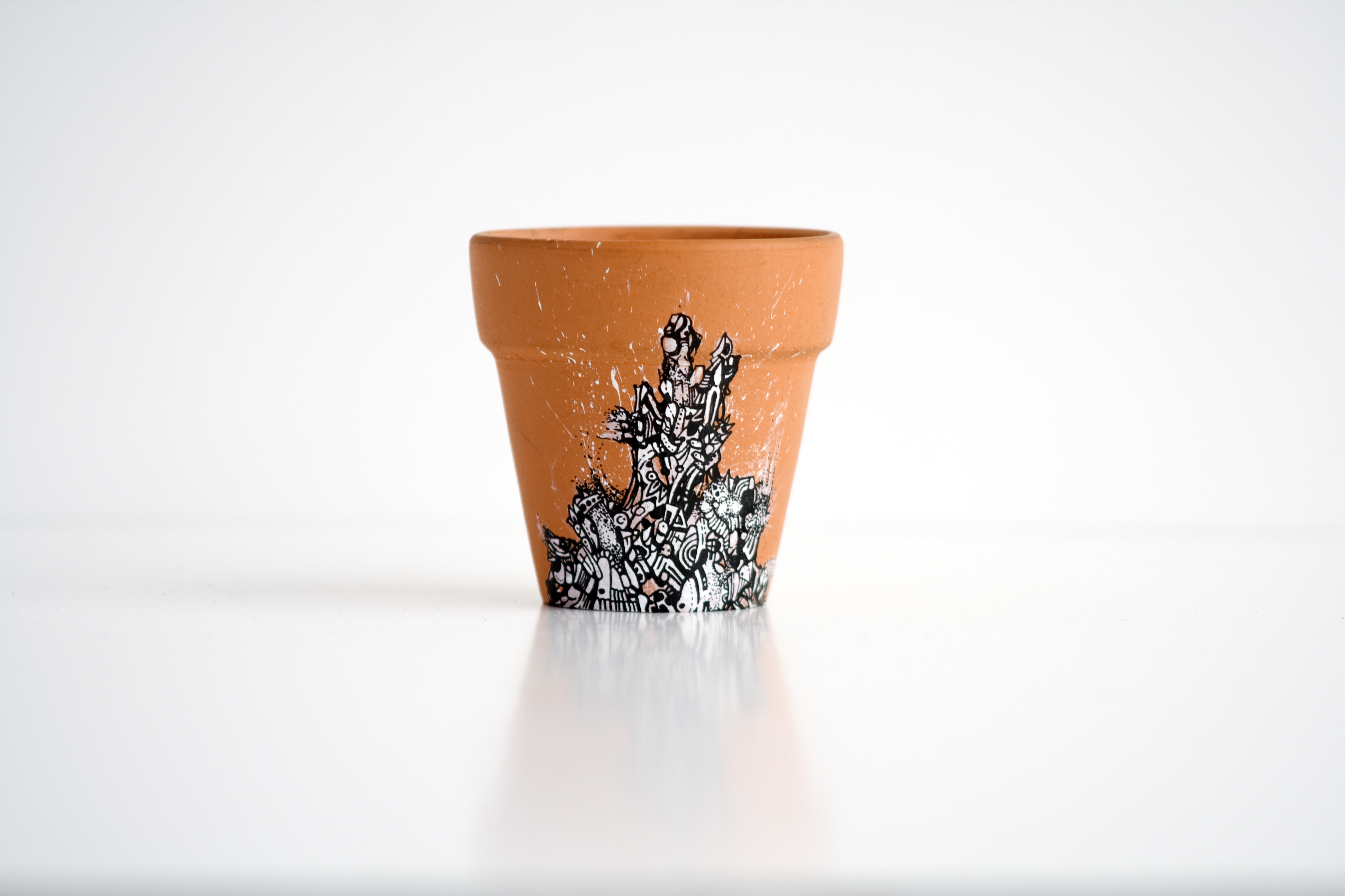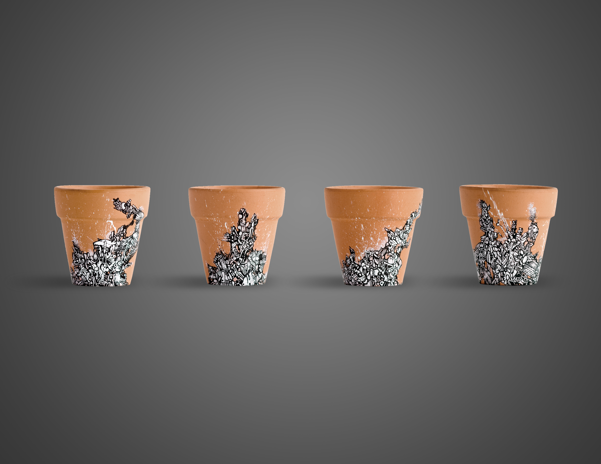 A series of hand-drawn artwork residing on the surface of four miniature terracotta pots. Grouped into a collective set, each is unique and features organic shapes spreading and consuming each clay pot. Created using a 0.25mm rapidograph with black india ink on white acrylic paint. Each pot measures 2.25 x 2 in.