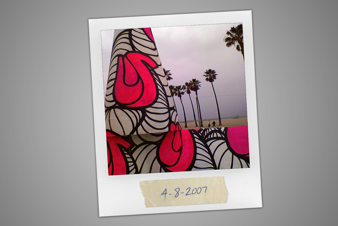 Around April of 2007, a large white, black, and pink mural appeared in the graffiti area of Venice Beach, Ca. The colors and line work were so beautifully executed that two pictures on a low resolution camera phone were immediately taken. Within a matter of days, the work was gone, without any trace of who created the work.